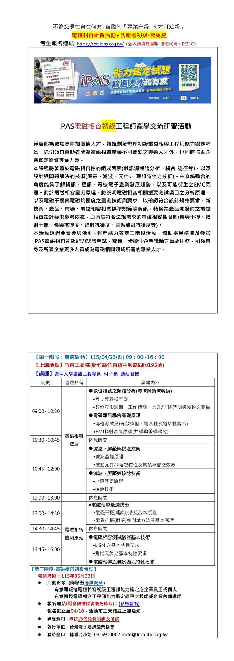 為協助企業建立電磁相容(EMC)基礎技術能力,經濟部推動之 iPAS 電磁相容初級工程師產學交流研習活動現已開放報名。本活動包含專業培育課程及初級能力鑑定考試,培訓與考試名額有限,符合資格者可免費參與。